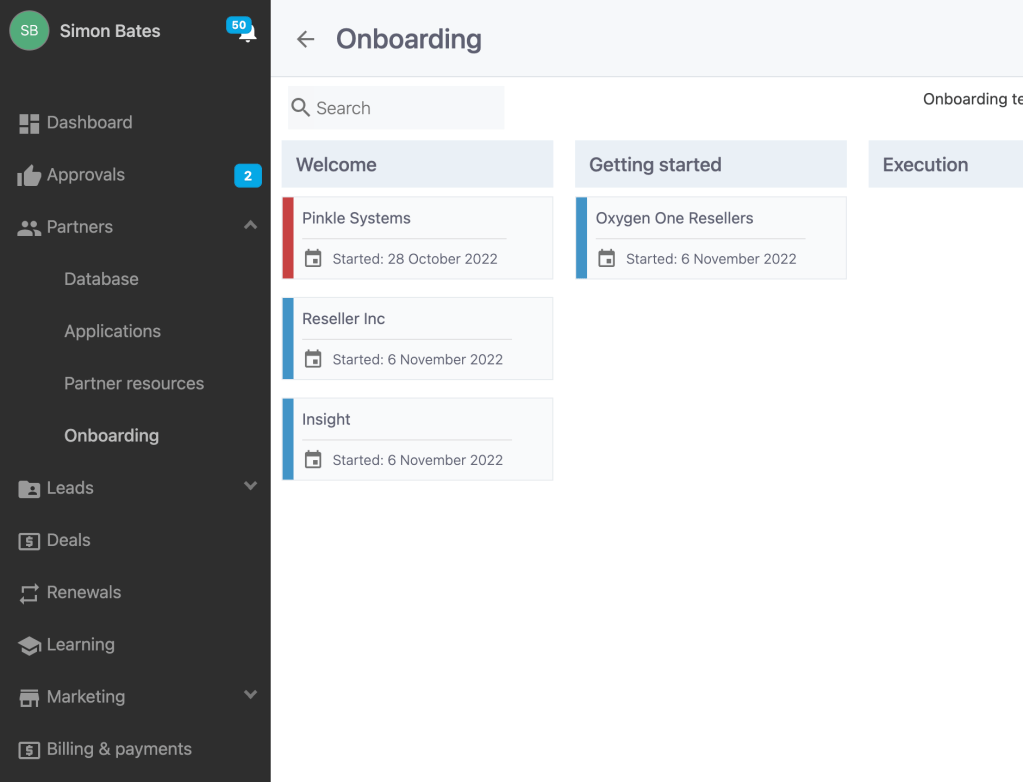 When you have a number of partners enrolled, a useful view is the overall Onboarding view, which shows the progress of onboarding by showing partner by stage. The view also highlights the partner entry according to the status of the partner’s onboarding.