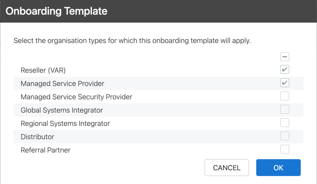 You can create an on-boarding template by selecting Partner Resources from the Partners menu and clicking on On-boarding Templates. Press the New Template button and choose the partner types that you want the template to be associated with.