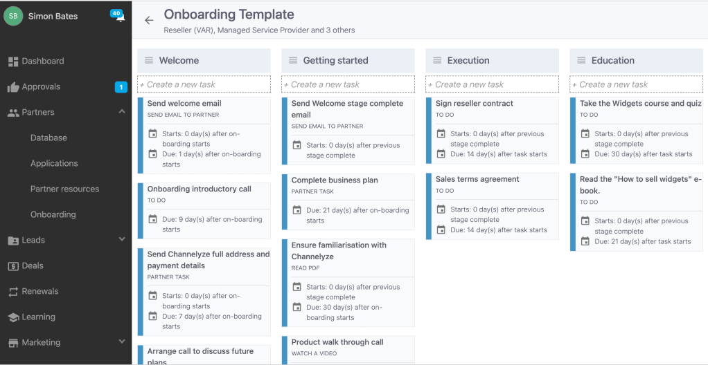 To get started, you first need to create an on-boarding template. This is a set of tasks with various start times and deadlines, which will be created for each new partner that you on-board. You can create different on-boarding templates for different partner types. So for instance, you would likely have a different strategy for on-boarding value added resellers compared to on-boarding distributors.