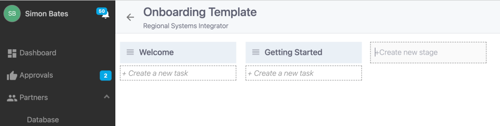 When you press OK, you’ll see an almost blank screen. The first step is to create the stages associated with the template. When you on-board a partner, their on-boarding experience is broken down into a set of stages, which you decide upon. For example, you may have a Welcome stage, where you send them a welcome email and invite them to an on-boarding introductory call. Then you might have a Getting Started stage where they might be expected to complete a business plan and start familiarising themselves with your product by watching an overview video. Next you might have an execution stage, during which business plans are agreed and partnership agreements are signed.