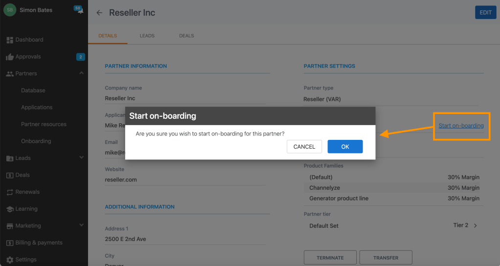 You are now ready to enrol your partners into the onboarding process. Open the relevant partner record from the Database page and click on the Start onboarding link.