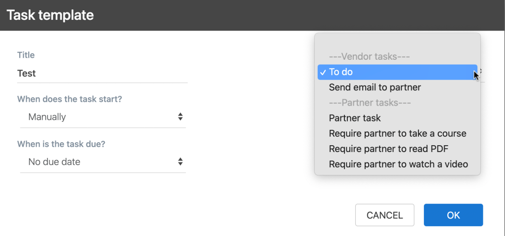 | Partner task | A task that shows to the partner once the task has been started. You can specify the name of the task that the vendor sees by specifying the text in the Partner Task Title field. You can also include instructions for the partner for the task by entering text into the Instructions for Partner field. |